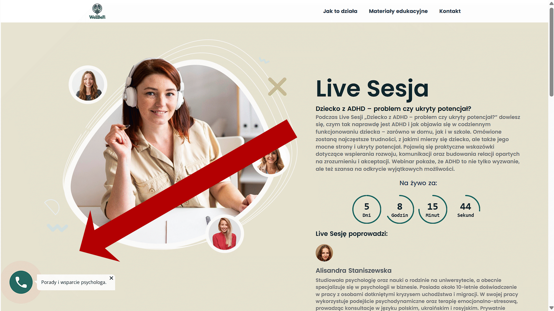 Wystarczy, że w czasie trwania wybranej sesji klikniesz w link z wiadomości e-mail lub odświeżysz stronę, na której nadajemy. Pamiętaj, że musisz być zalogowan*. Gdybyś napotkał* trudności w dołączeniu, sprawdź poniższą instrukcję lub skontaktuj się z nami pod adresem: support@wellbefi.pl